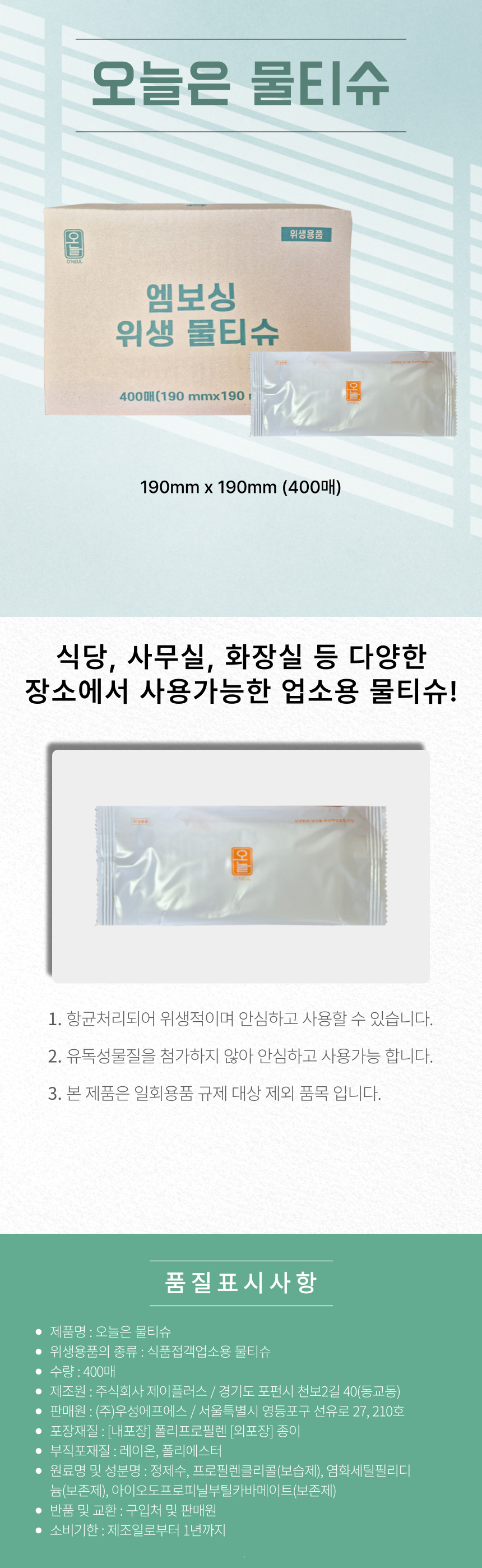 ■ 품명 및 모델명 : [업체배송]오늘은 엠보싱 위생물티슈 1박스(400입)