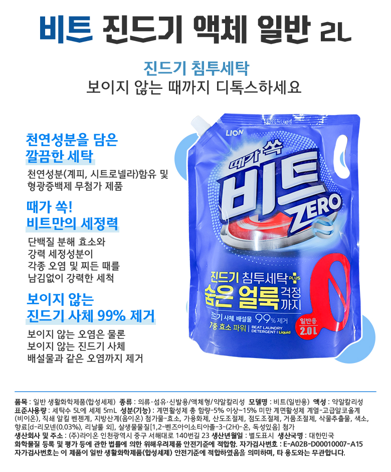■ 품명 및 모델명 : 라이온 액체비트 2.0L 일반 진드기침투세탁(파우치)