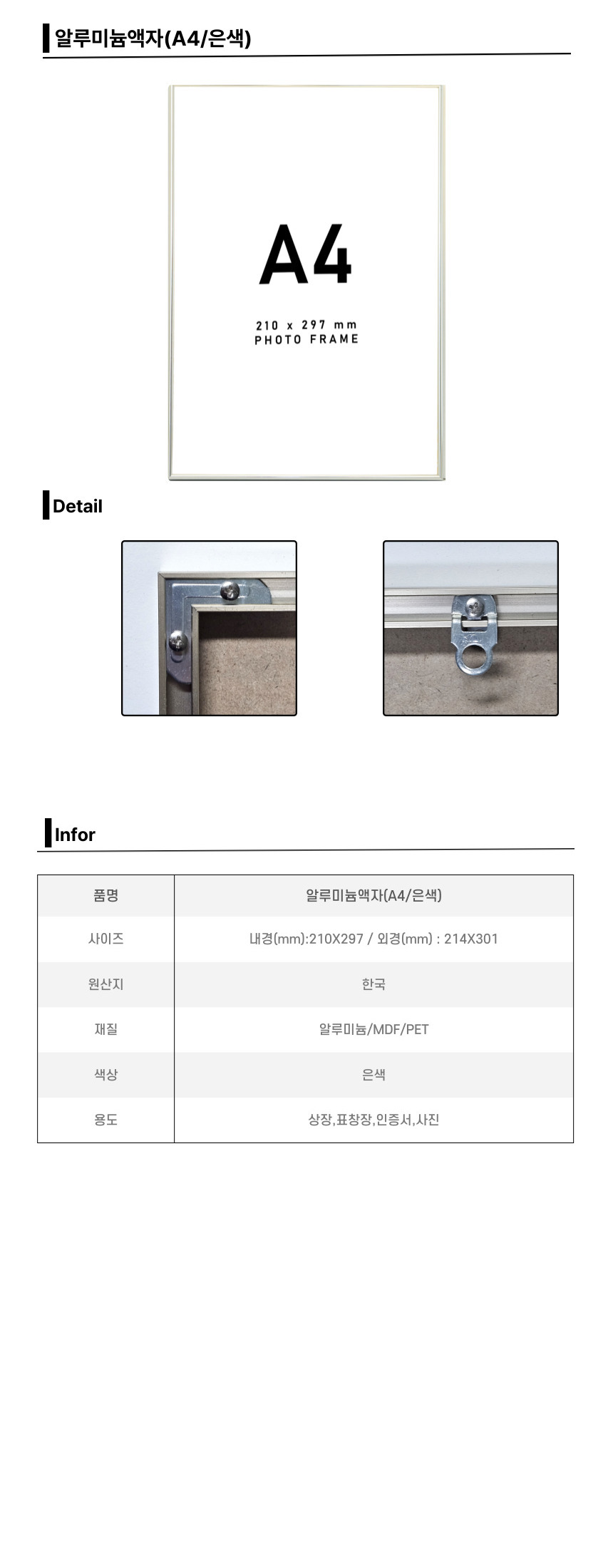 ■ 품명 및 모델명 : 알루미늄액자(A4/은색/내경: 210*297mm)