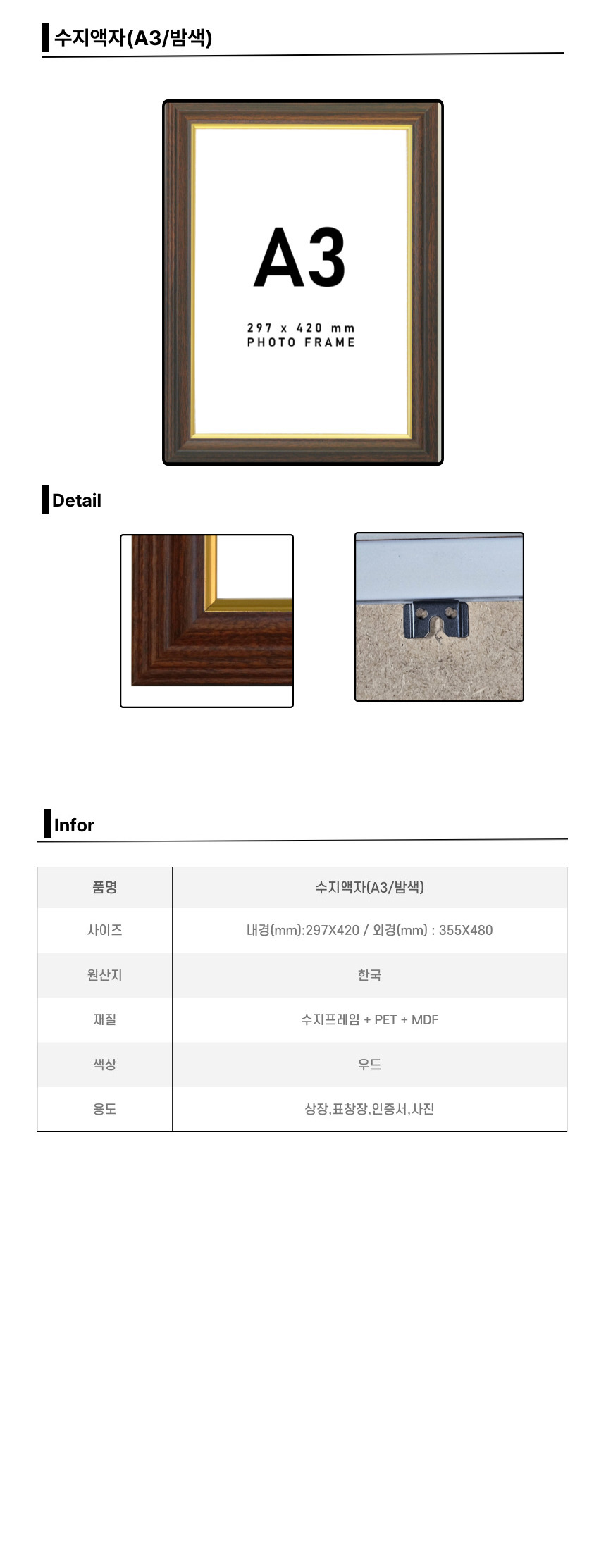 ■ 품명 및 모델명 : 수지액자(A3/밤색/내경: 297*420mm)