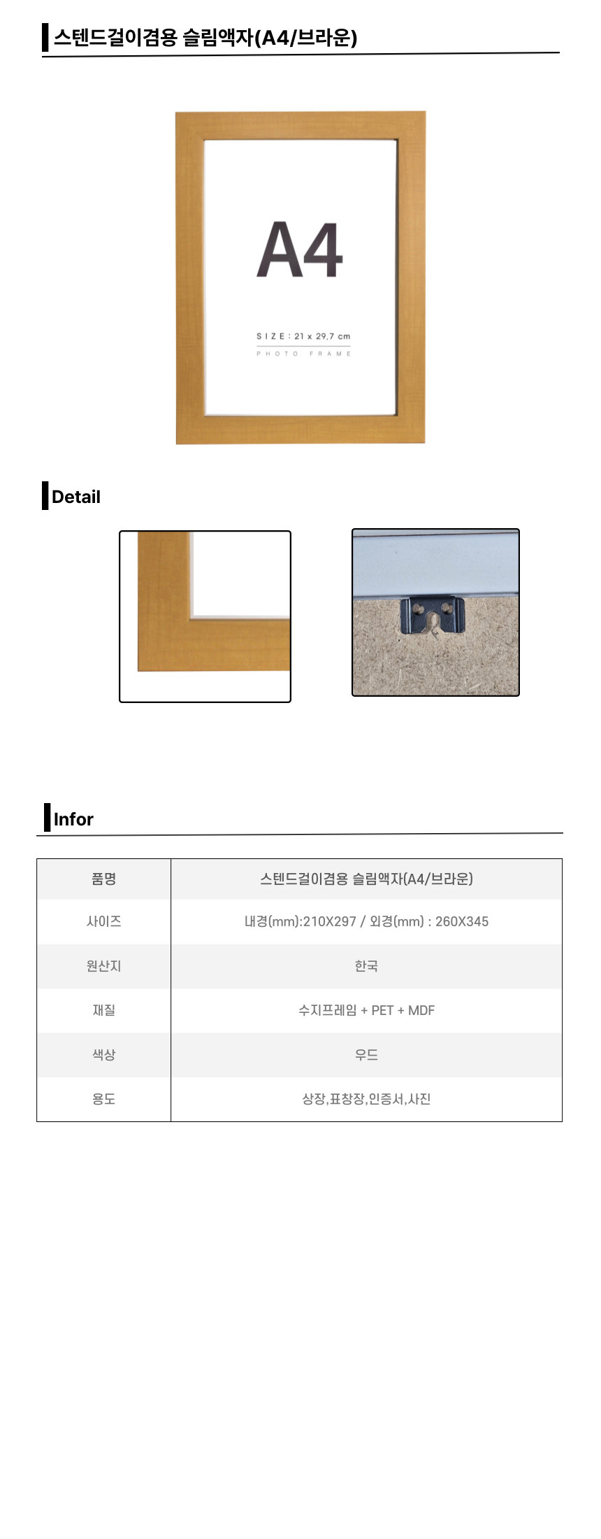 ■ 품명 및 모델명 : 스탠드걸이겸용 슬림액자(A4/브라운/내경: 210*297mm)
